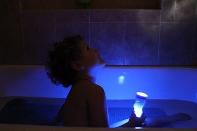 This is a spin on the BUBBLE BOY Post. My girls love all things glow in the dark. They have been asking to do GLOW AND SEEK for a while now. They can never make it up until dark... so I thought I would bring the dark to them. AK and her son came over for the fun as well. :-)